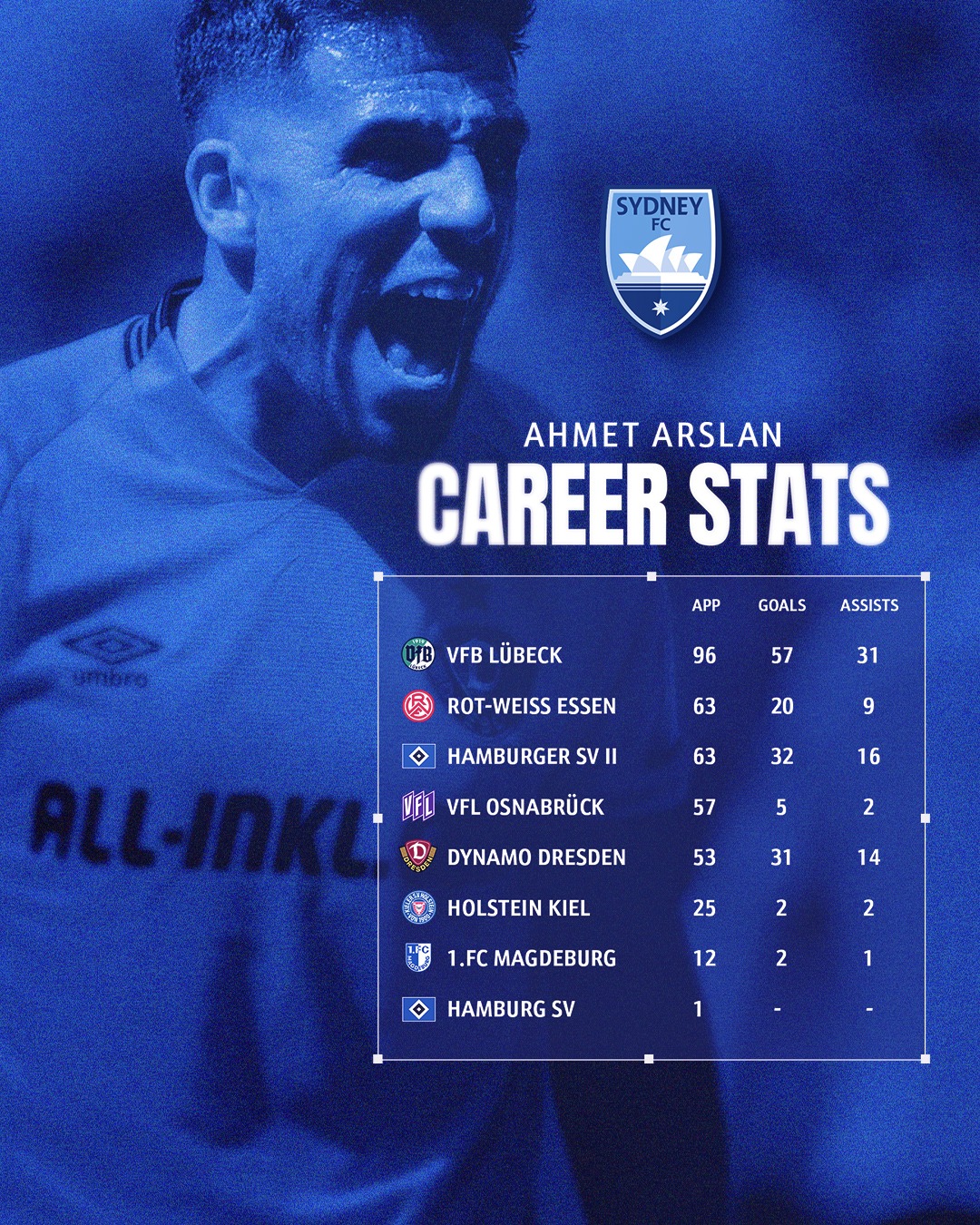Over the last three and a half seasons in Germany’s ultra-competitive second and third divisions Arslan has produced a remarkable return of 53 goals and 24 assists in just 128 matches, underlining his status as a forward who consistently delivers end product.