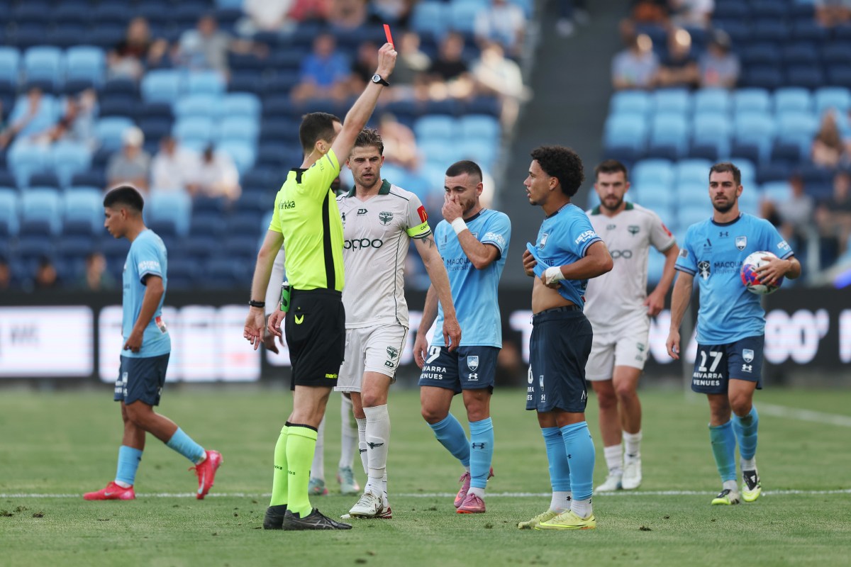 Rhys Youlley of Sydney FC is shown the red card.