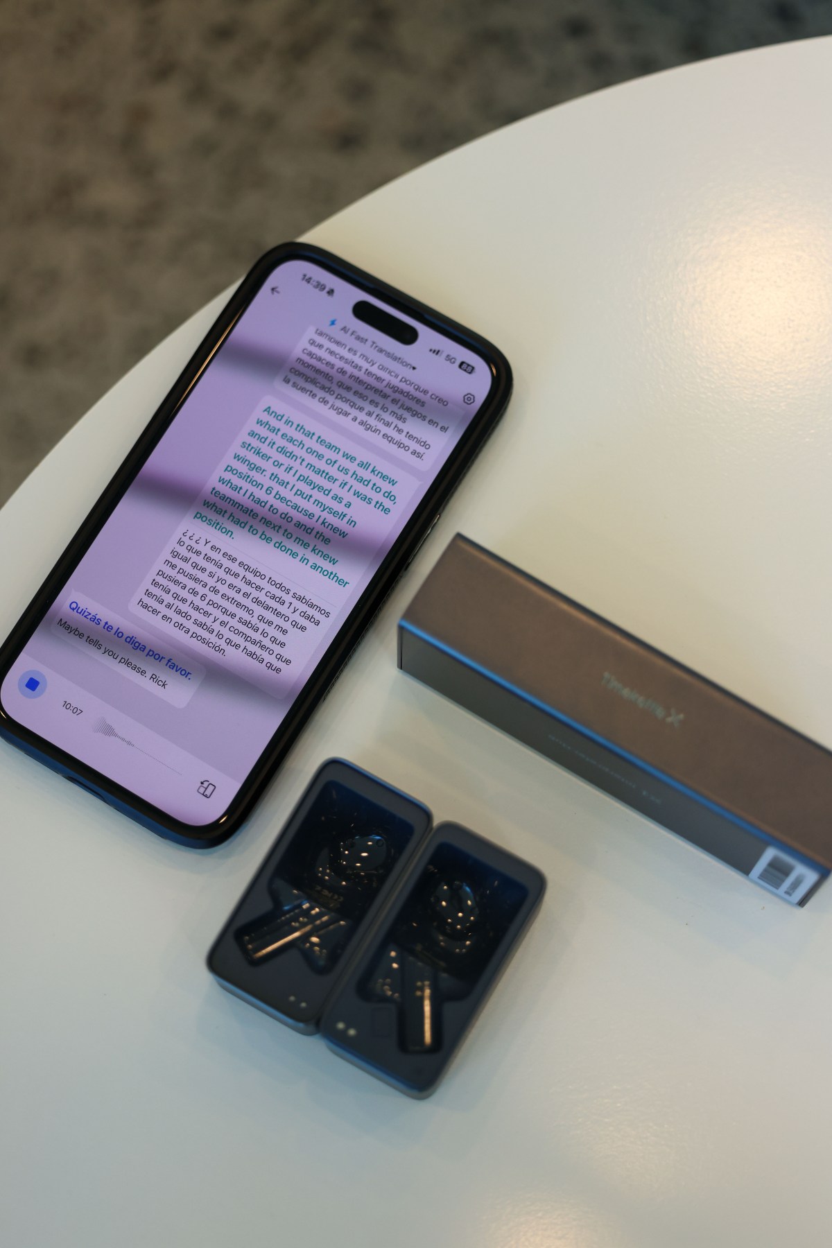 It also works as a communicator with back and forth talks while both players or coaches wear an ear piece each and their words and translated back into languages that they understand easily. While this occurs, the translation also appears on the phone in both languages and can be read as a transcript of the conversation.