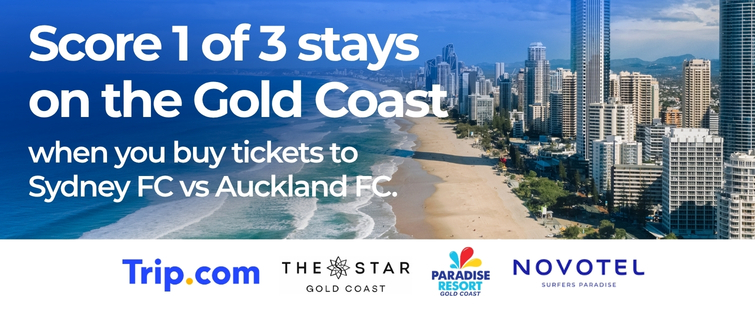 Sydney FC fans, this is your moment. When you purchase a ticket to the Sydney FC vs. Auckland FC Match on 26 April, youโll automatically go into the draw to win 1 of 3 hotel stays on the Gold Coast, proudly brought to you by Trip.com.